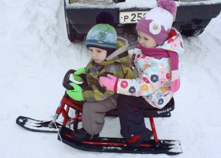 На днях же достала из подвала свои детские санки, без спинки, думала легко дети вдвоем сядут, но нет. Сели, но ногам не удобно, волочатся по снегу, Яша отказался, встал и шёл пешком. Варя одна ехала. Поэтому подумала про снегокат. А тут ещё пост Ксюши увидела про санки для двоих.