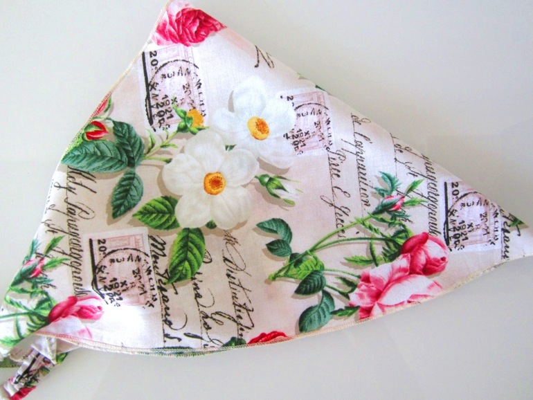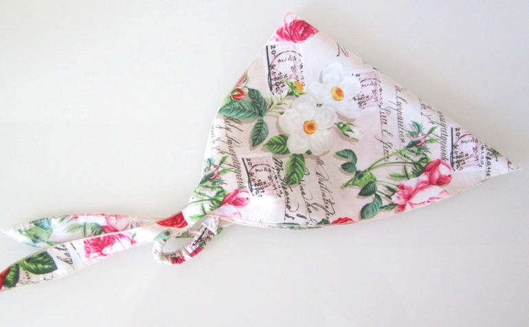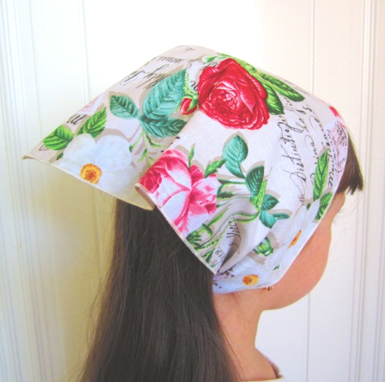 20) Косынка на завязках "Розы и шиповник" - большие букеты роскошных роз и букетиков цветов шиповника на молочном, слегка состаренном фоне с надписями в винтажном стиле - 650 руб.