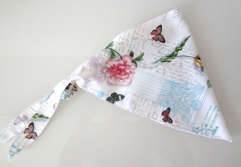21) Косыночка с завязками "Бабочки и тюльпаны" - на розово-сиреневом фоне, очень нежно и изящно - 650 руб.