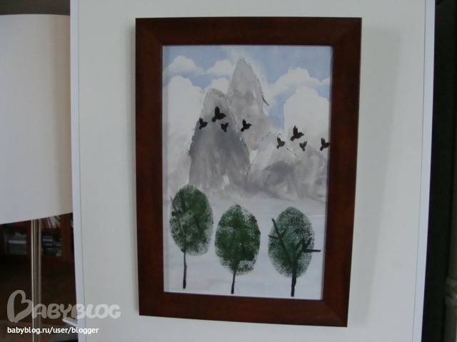 Я рисовала контур гор (которые Тимур закрасил кистью) и стволы деревьев.