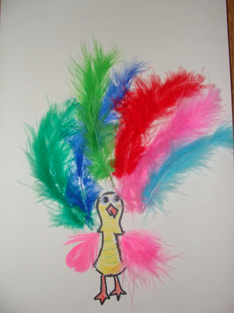 Я предварительно наклеила на лист двусторонний скоч и сын мог спокойно выкладывать перышки в произвольном порядке. Теперь эта птичка висит на холодильнике и очень поднимает всем настроение (и аппетит))