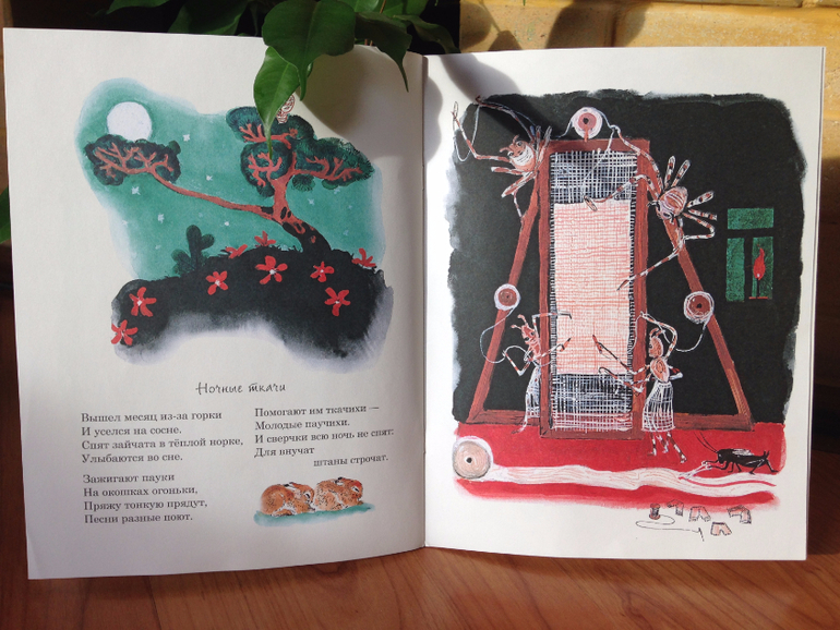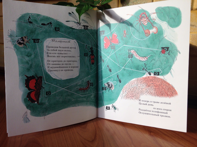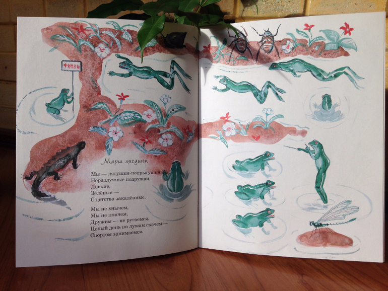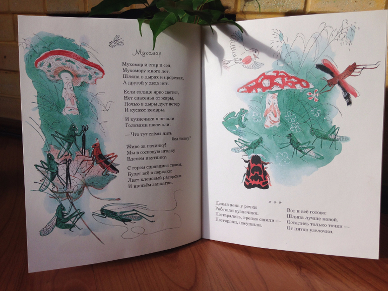 Стихи прекрасные, очень добрые и непосредственные, дочери сразу полюбились, да и мне тоже. В сборнике несколько стихов: одноименное названию книги, «Баня», «Ночные ткачи», «Марш лягушек», «Мухомор», «Телефонист». Все герои этих стихов - животные и насекомые, о них слушать деткам всегда интереснее.