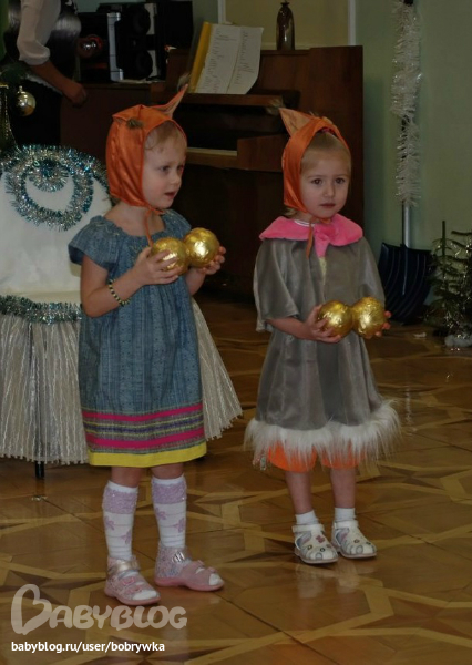 25 декабря у нас состоялся Утренник в Детском саду. Василиса участвовала в двух ролях: мышка и белочка. Очень здорово выступала!!! Открывала концерт, хорошо и громко говорила свою речь. Но, когда появился Дед Мороз и Снегурочка, она не захотела больше выходить к ёлке. Уселась мне на колени, прижалась и сидела так до конца утренника((( Было очень обидно конечно...