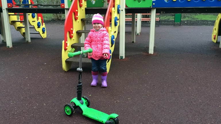 Она выпросила печенье, уселась на его самокат с сидением (у нас дома точно такой же) и каталась по дорожкам.