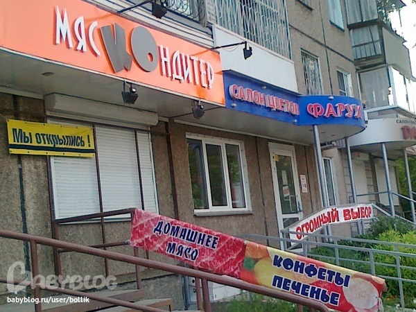 Совсем рядом появился новый магазинчик со странным и лично для меня отталкивающим названием "Мяскондитер". Как то нет желания покупать конфетки лежавшие рядом с мяском)).