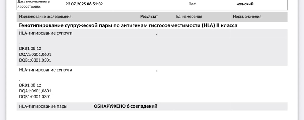 Добрый день! Подскажите, в анамнезе 3 бхб и стремительно падающий амг. Ре предложила ЭКО. В рамках общей подготовки сдали ряд ген.анализов (hla типирование, кариотипирование, ломку х-хромосомы, днк фрагментацию). Пока готов только один, но уже тут результаты спорные. Скажите, может ли 6 совпадений были причиной невынашивания и показанием к пгд ?