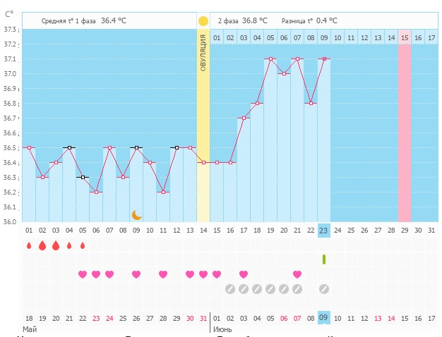 19ДЦ (5ДПО) - ух ты!! 37,1😳 вот это скачек... Программа ставит О на 16ДЦ... средняя температура первой фазы 36,4, второй фазы 36,9, разница 0,5... Но я то знаю, что это не так. Выставляю О как было на самом деле по УЗИ (на 14 ДЦ) - естессно перерасчет температур, разница всего 0,3, но это же только начало второй фазы.. Все будет хорошо....