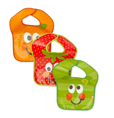 Когда пришло время вводить малышке прикорм, столкнулась с такой проблемкой, как выпачканная одежда. И если пятна, например, от кефирчика легко отстирывались, то от фруктовых пюрешек я так и не отстирала многие футболочки. Проблему решила, купив в веселые яркие слюнявчики с изображениями фруктов. Танюшка совсем не против была их одевать- они легко сзади застегиваются на липучке. Мне понравилось, что на слюнявчиках крупные глазки и ротик нарисованы. Честно говоря, прикорм кушал ребенок мой не очень хорошо, и мы с ней придумали игру- один слюнявчик я ей одевала на шею, а другой- клала на столик, и пока доченька «кормила» свою клубничку или апельсинчик, я кормила её. Потом без труда мыла оба слюнявчика. Так и одежда чистой оставалась, и процесс еды стал нам обеим приносить кучу положительных эмоций.