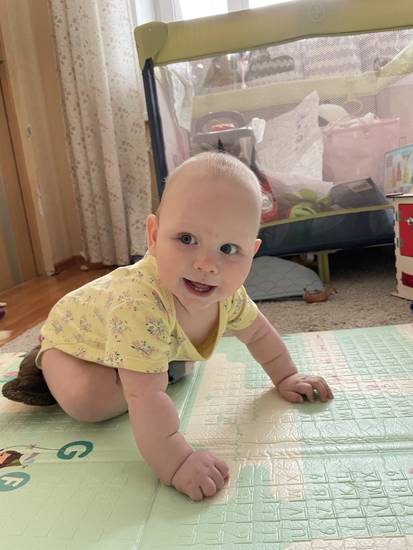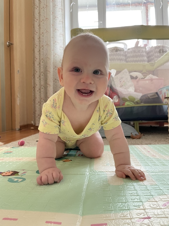 Ползать не ползает никак. Но передвигается по всей комнате😂 Встает на четвереньки а потом ложится вперед, короче как гусеница 🐛 Так до игрушек и доползает.