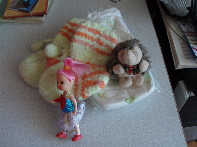 хих, сюрпризики для малыша! но ЁЖИК МОЙ!!!!носочки просто прелесть-Натусь, сама вязала чтоли? такие мягенькие и цветовая гамма просто прелесть..как раз в моем вкусе!!!куколка малюська такая))))ааа, и еще памперс))))клево!!!