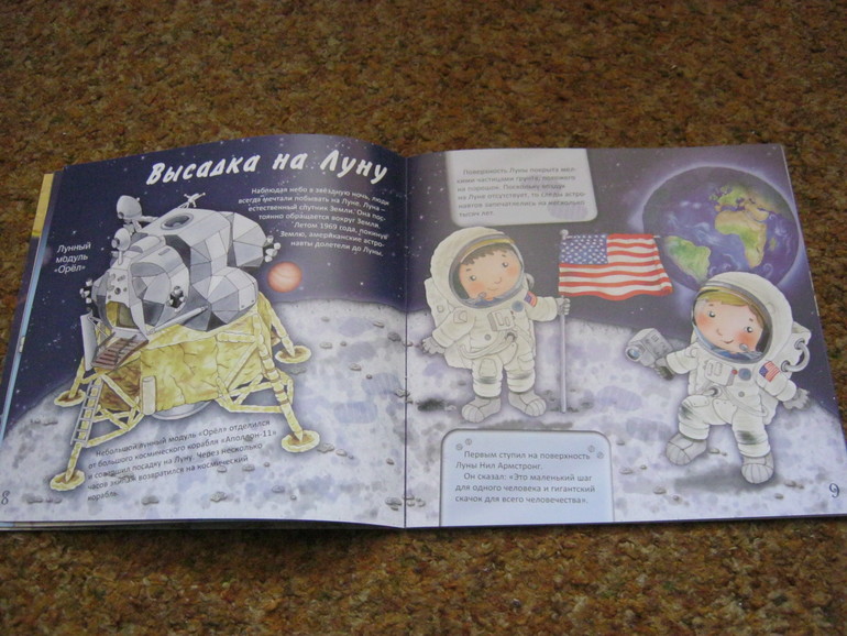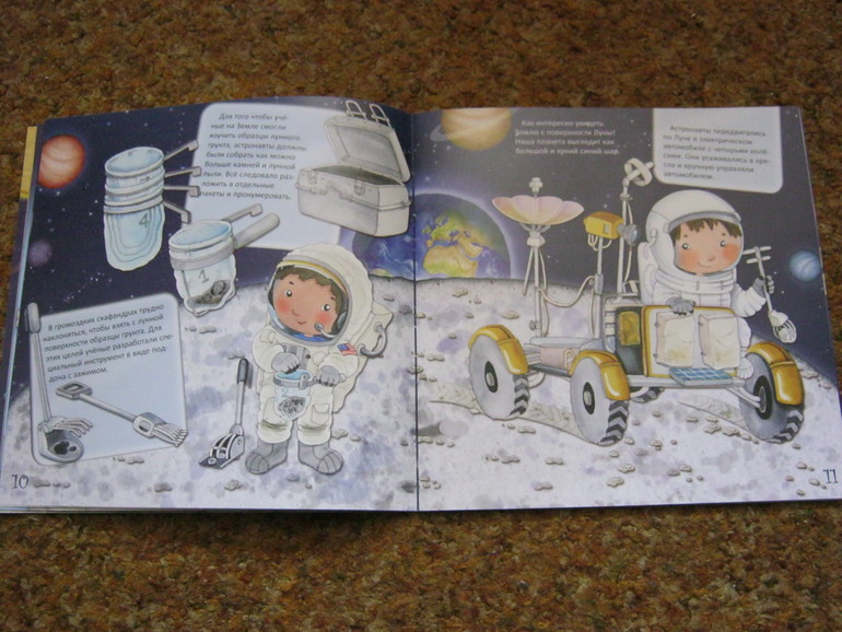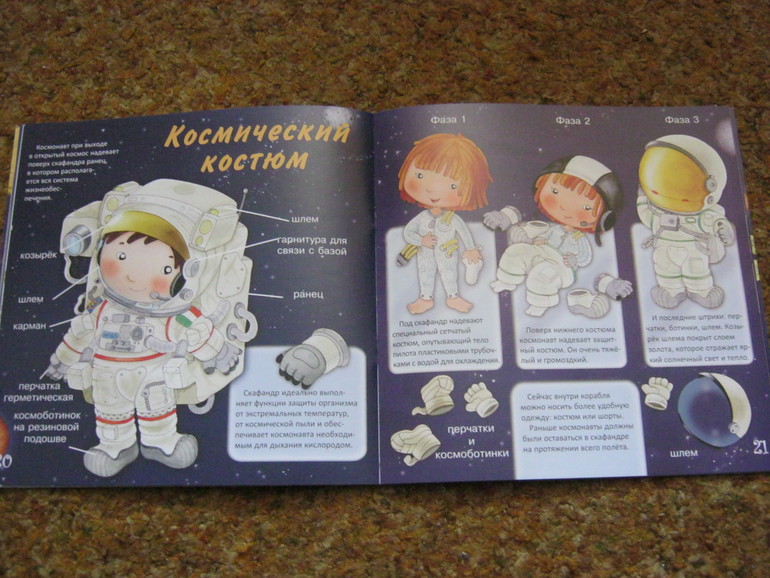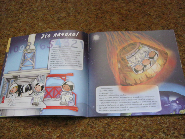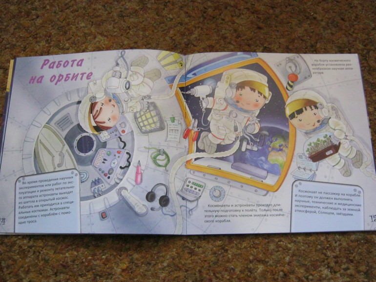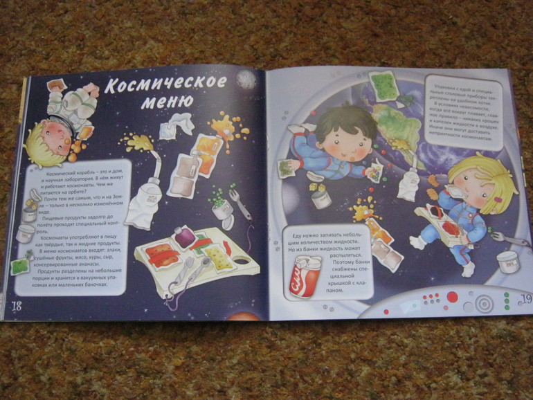 Она как раз подойдет для первого знакомства малышей с темой. Текста немного - он доступен и понятен малышам, а показано в книге довольно многое, что самое привлекательное - освещается быт современных космонавтов, конечно, всего несколькими фразами, но вкупе с картинкой - это уже кое-что.