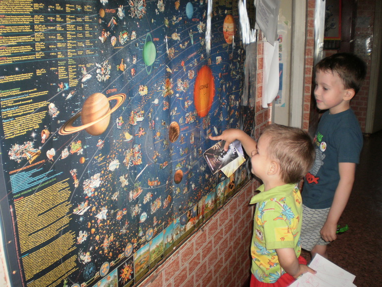 Очень любят карту Солнечной системы. Около нее мы строимся перед едой, чтобы помыть руки, да и в течении дня периодически рядом топчутся, разглядывают, читают. кто умеет.
