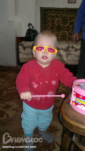 Сидели дома, в самом присамом семейном кругу. Пока я салаты наготовила, икру намазала, и проч., Миша устал, и праздничные фотки получились с грустным лицом(( Конечно же, надарили нам кучу подарков, игрушек, барабан, и еще кучу всего, что не распаковали еще. Съездили в деревню, где бабугки барабан и вручали))) Вот такой музыкант (очки из кукурузных палочек, типа российский киндер сюрприз):