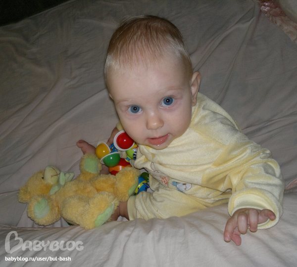 Научился вставать на колени, держась за борт и передвигаться так)) А ЕЩЕ, новая забава - мячик гоняем взад назад руками и ржем, я ему, он мне, и т.д. по кругу))