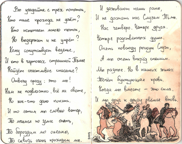 моё творчествоВ детстве я писала книгу в жанре фэнтезийного средневековья. Она и сейчас продолжает сочиняться у меня в голове. :))