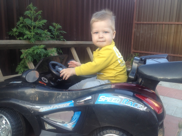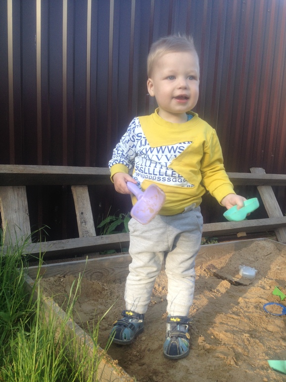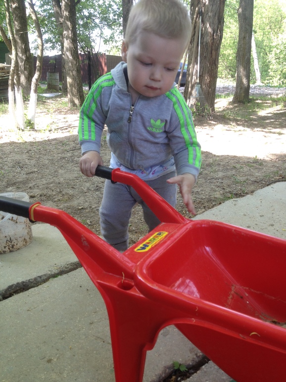 Затем мы сделали ему песочницу, приобрели маленькую тачку и он стал песок из песочницы перевозить во все стороны. После песка возили в ней камни, соседские кабачки, яблоки и все, что плохо лежит. Во всяком случае, тележка- игрушка №1 этого лета.