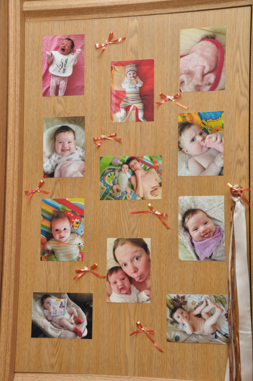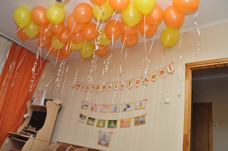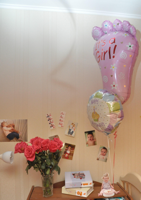 Ну и немного об оформлении. В комнате с утра (субботы) Нюсю ожидали 33 воздушных шарика! На стене две самодельные растяжки: "Нюсечке 1 годик" и фото по месяцам.