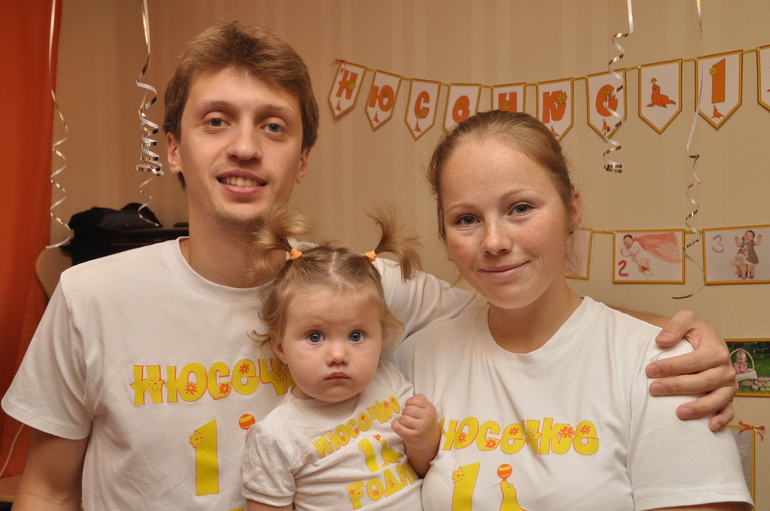 Что касается одежды, я не стала мучить Нюську и себя платьями) Мы выбрали простой обходной и милый путь - family look. С заказала футболки с нашим логотипом Дня рождения для нас троих. Было комфортно и красиво (надеюсь :) ). Правда заказывала через интернет, и товарищи в печати немного исказили цвета - надпись получилась желтой вместо оранжевой, но это такая фигня!)))))