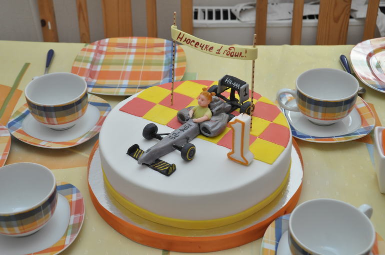 Потом снова игры в комнате, а на кухне тем временем смена декораций - готовим чай и "изюминку" дня - Первый Нюсин торт! Делала на заказ, все были в восторге!