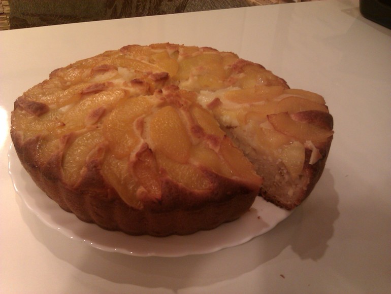 2,5 стакана муки Слить сок с персиков, нам нужен стакан.Яйца взбить с сахаром, добавить размягченное масло,сок,затем ванильный сахар, разрыхлитель,соль, по немногу муку.Вылить тесто в форму или на противень, украсить персиками и выпекать при 180 градусах примерно 40 минут.