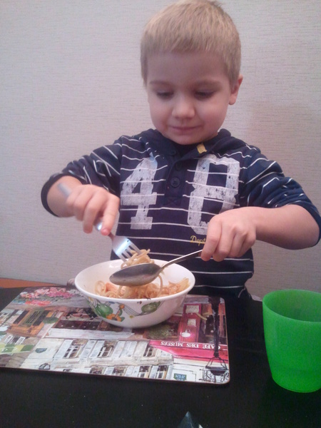 Макароны... ой... пасту... ребенок ест исключительно с ложкой :)