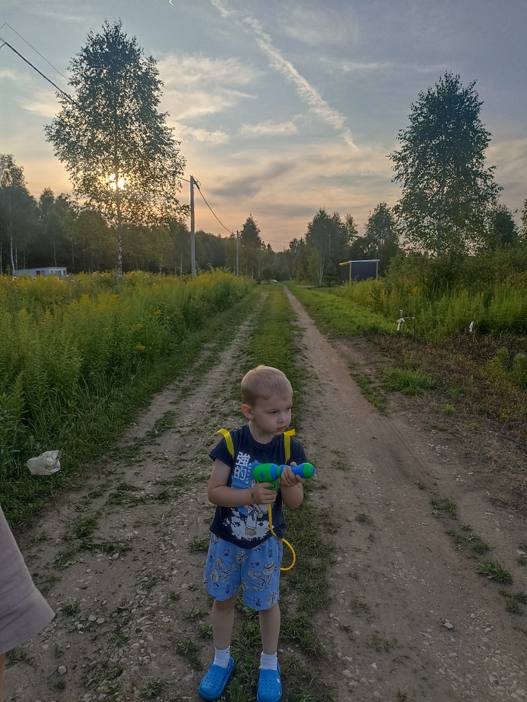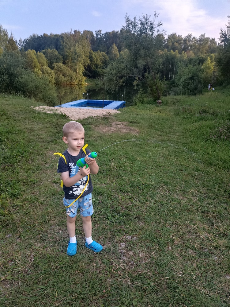 Опробовали водный пистолет в деле, покушали сладких груш и первый раз попробовали окунуться в озеро, по пояс для начала)))