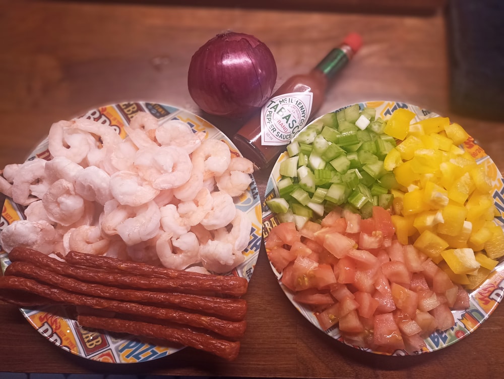 Креветки (я взяла очищенные, чтобы не заморачиваться), сырокопчёные колбаски, помидоры, сладкий перец, сельдерей, лук, соус Табаско🔥, из приправ ещё нужна копчёная паприка и тимьян.