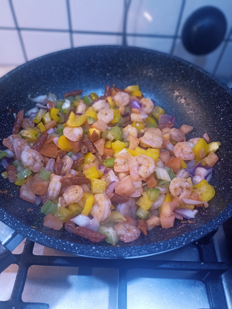 В большую сковороду или казан или вок отправляем обжариваться креветки, колбаски, чуть попозже овощи, добавляем соус, приправы. С табаско только не перебарщиваете) несколько капель на большую сковороду будет достаточно! Всё жарится быстро довольно, как вок, на среднем огне.