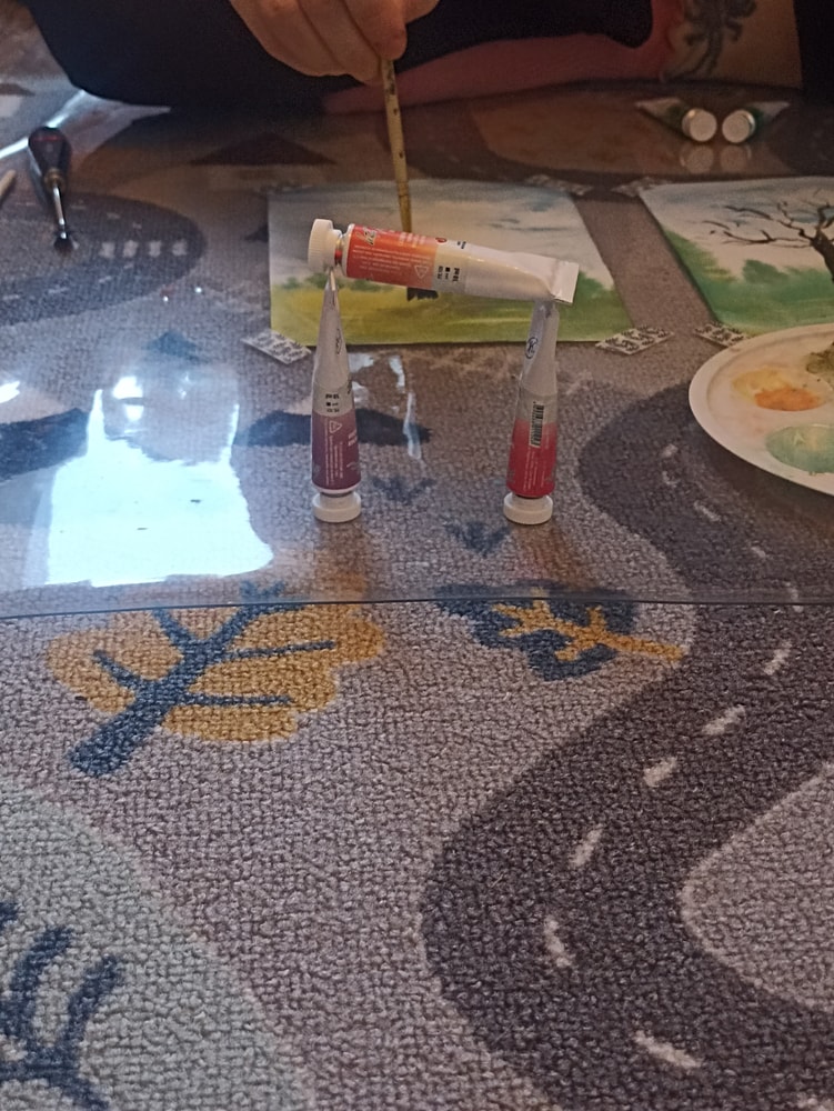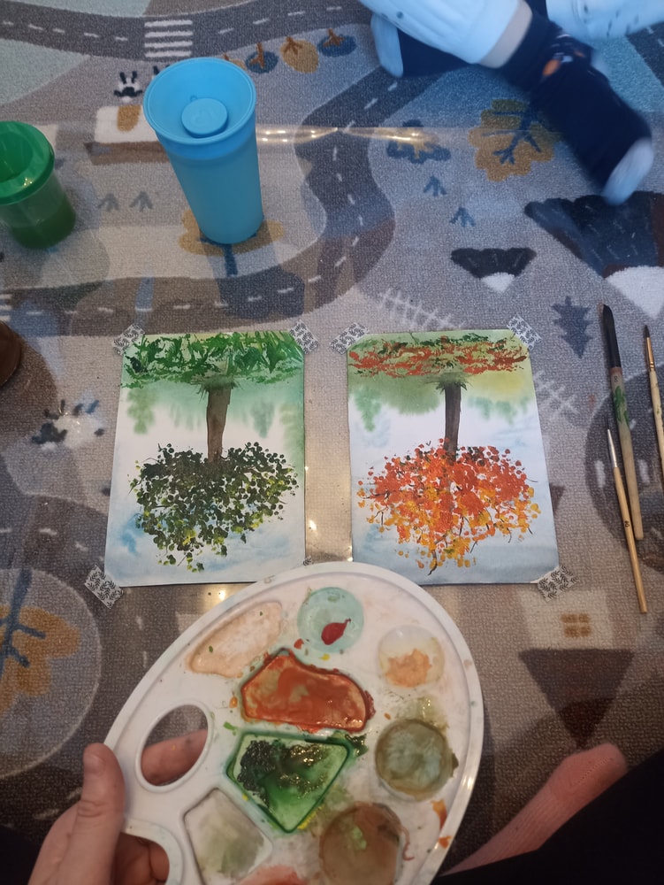 Чтобы не скучать дома, решили попробовать порисовать ватными палочками. Гуашь испортилась, пришлось брать мои акварельные краски в тюбиках))