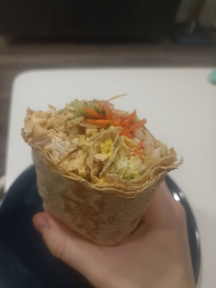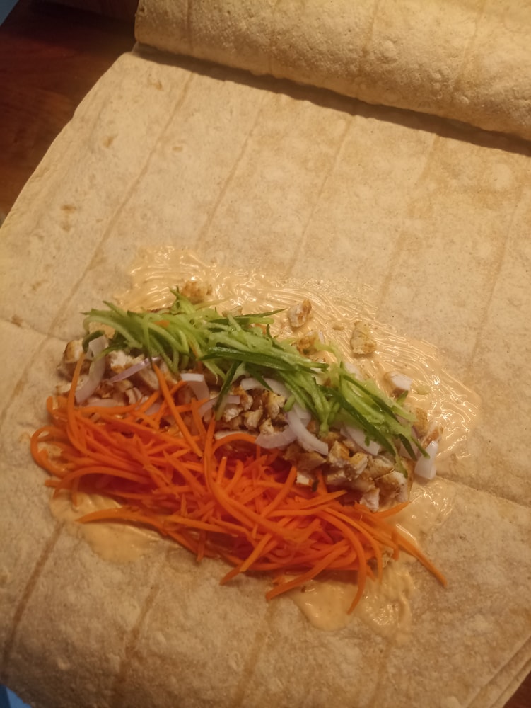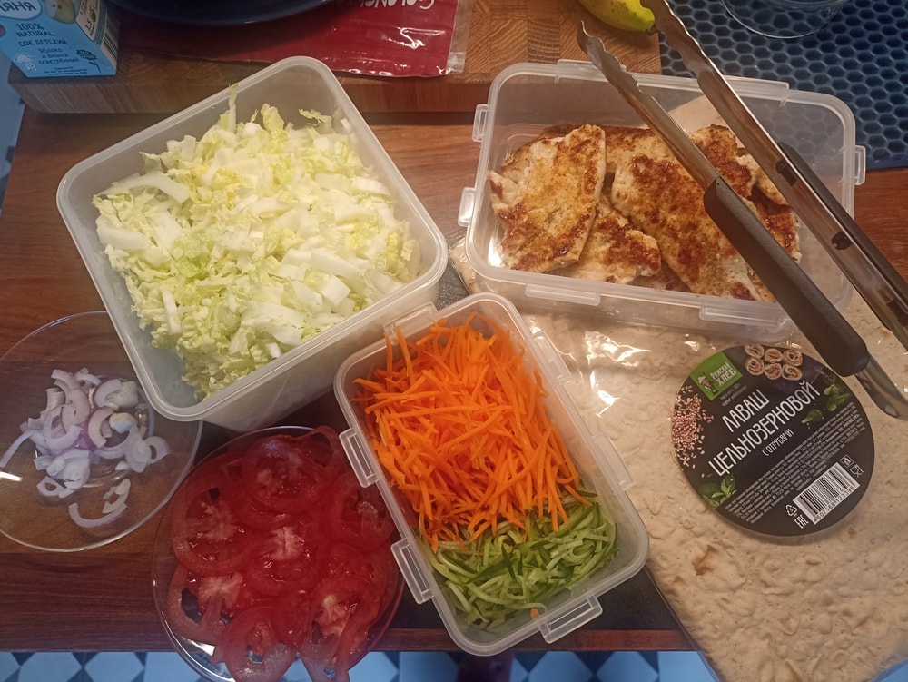 Цельнозерновой лаваш, пекинская капуста, лук, помидор, огурец, морковь, курица конечно.