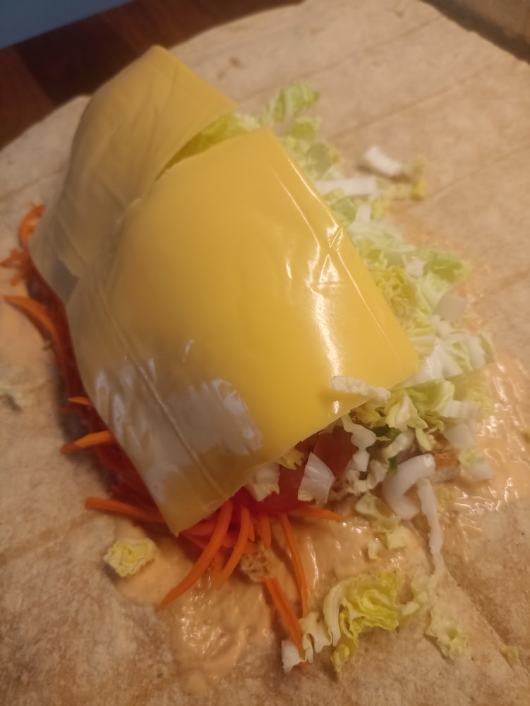 Мужу дополнительно сыр)) А так никаких хитростей - положил и завернул. Единственная хитрость: если огурцы и помидоры очень мокрые, их лучше промакнуть бумажным полотенцем, иначе вот это всё потом течь будет...