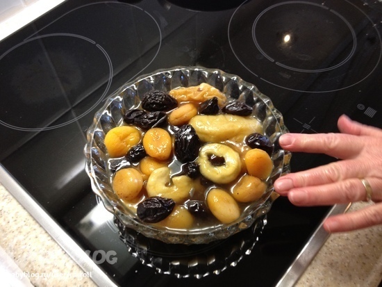 Покупаете сухофрукты очень хорошего качества, мясистые такие - чернослив, курага, может быть изюм, если получится - персики. Промываете их теплой водой, выкладываете в миску, натираете туда цедру 1 лимона и заливаете с верхом теплой водой, оставляете на всю ночь. На следующий день выливаете в кастрюльку, даете закипеть, убавляете огонь, добавляете на свой вкус сахара или меда и провариваете на маленьком огне минут 15. Следите, чтобы фрукты не разварились, они должны сохранить упругость. Вынимаете фрукты, выкладываете в парадную емкость. Растворяете в теплой воде столовую ложку крахмала, хорошо размешиваете, чтобы не было комочков, добавляете во фруктовую воду, даете закипеть и провариваете 1 минуту, заливаете этим соусом фрукты. Даете им остыть (можно в холодильнике).