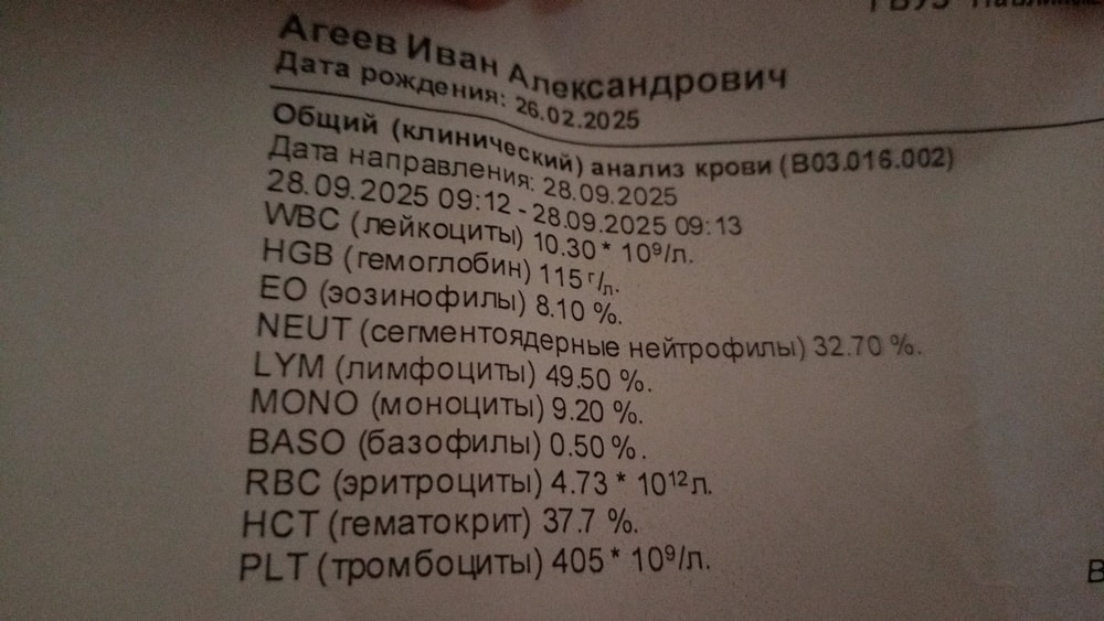 Добрый день. Сын болеет 6й день без температуры. Началось все с соплей, потом конъюнктивит, потом подкашливания , а сегодня кашель и нос заложен, все хрюкает. Вчера были у педиатра, хрипов нет назначала лечение, если поправки не будет то аб. Сегодня сдали кровь. Посмотрите, какая она ?