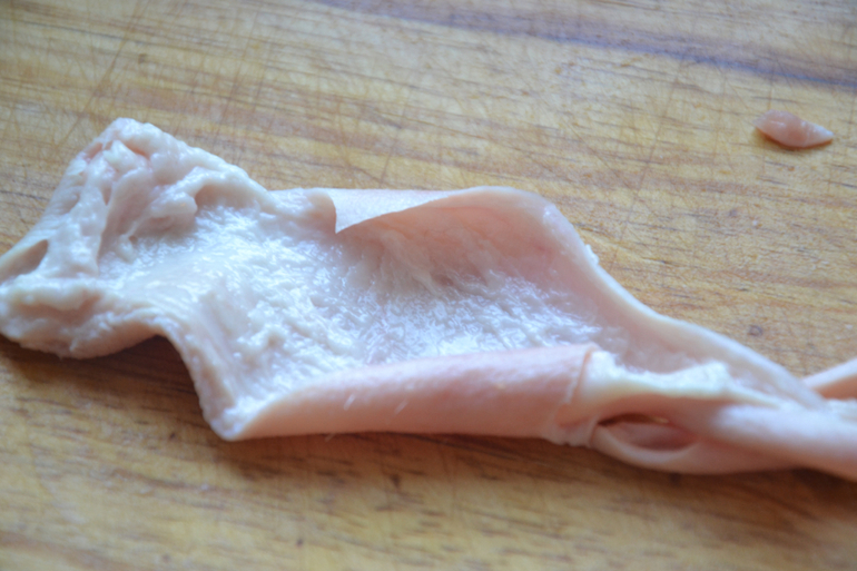 Вначале этот кусок не понять чего я приняла как раз за кусок не понять чего, болтающийся на краешке куска мяса. Потом дошло - это шкура, да еще и с, прости, госсподи, салом (вероятнее всего).