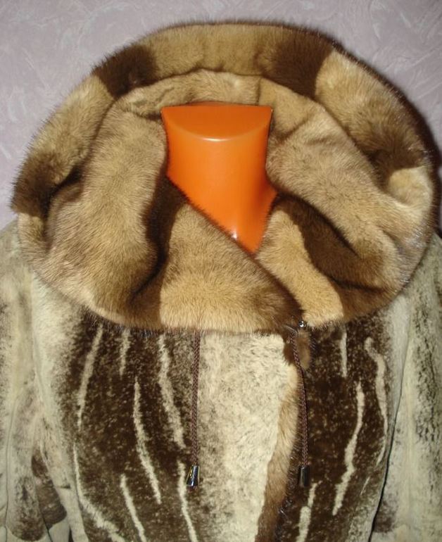 Шуба из меха бобра с норковым капюшоном, манжеты из норки.