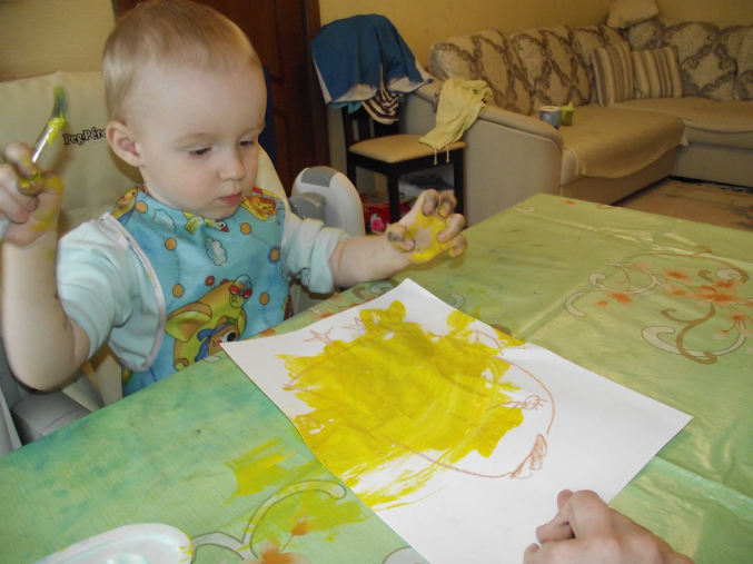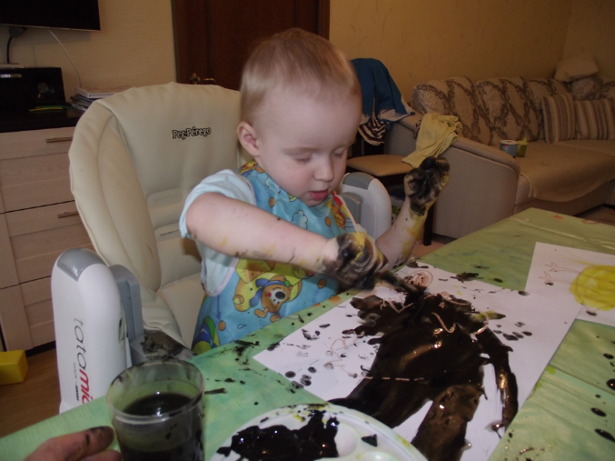 Наше рисование это мазня, постучать ладошками по краске, залезть по уши в воду в стаканичке, забрызгать все вокруг - стульчик, стол, полы, ковер, стены..............пойдем в ванну, там все обляпаем.