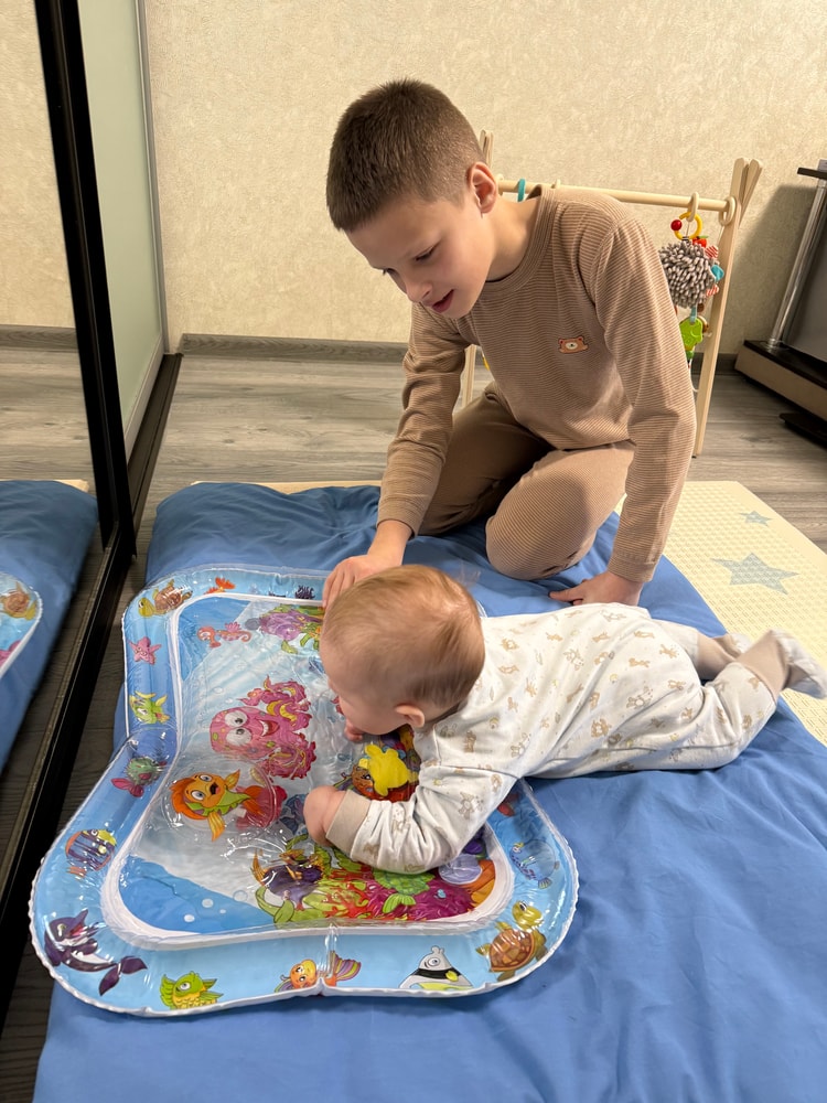 Много разных звуков произносит,прям болтает что-то на своём,очень интересно слушать😇🤍 из любимых игрушек так и остались : заяц Алило, мобиль. Подкупила ещё мобиль Мантессори (деревянный такой с бусинками), ещё нравятся игрушки мягкие с бренчащими деталями,которые можно везде прицепить☺️ ,ещё прикупили водный коврик,интересно зайдет или нет,по мне так прикольная игрушка)