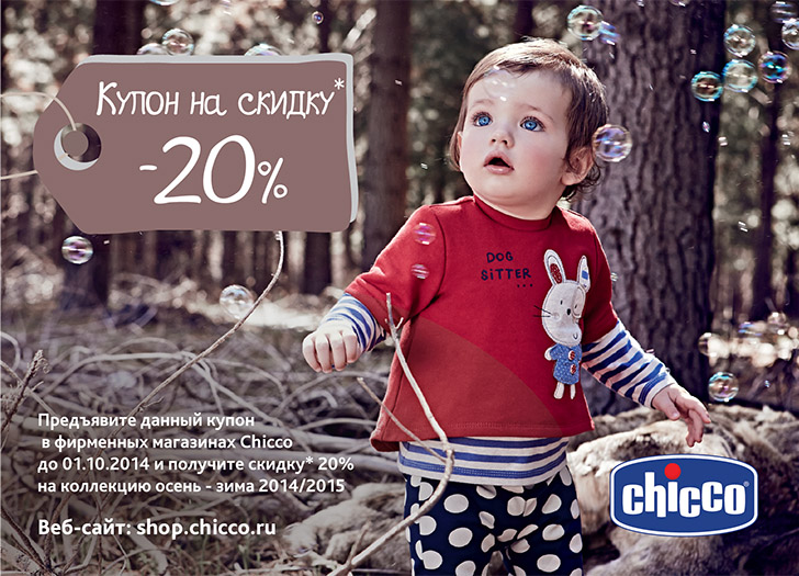 Воспользоваться купоном можно будет до 1 октября 2014 года во всех фирменных магазинах Chicco.