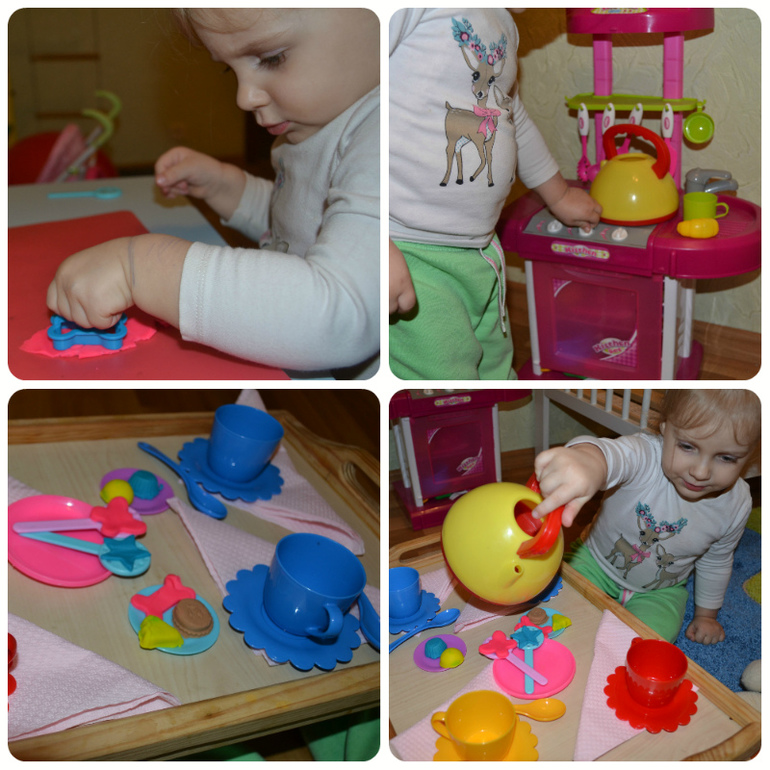 4. Устроили чаепитие. Сначала из массы для лепки приготовили конфетки-печеньки для наших гостей. Алиса выбрала, кого она хочет пригласить. Накрыли на стол и пришли наши гости.