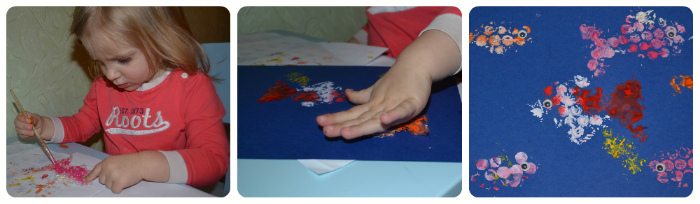 2. Черное рисование. У нас получилось не черное, а синее рисование и рисование пленкой. т.к. черной основы дома не оказалось, и возможности выбраться купить не было. Рисовали рыбок в море. Алисе очень понравилось такое рисование. А рисование на черной бумаге сельдереем очень хочу попробовать)))