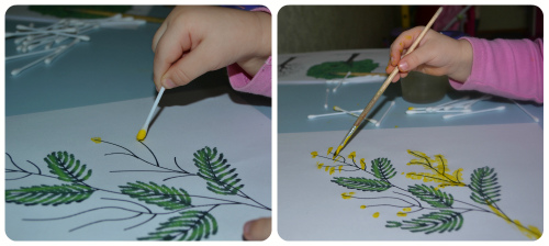 1. Букет мимозы. Планировали рисовать мимозу ватными палочками, но что-то моя девочка в этот день была не в духе, палочками особо рисовать не захотела, решила, что кисточкой получится куда лучше. еще и всю веточку хотела закрасить желтой краской))) Хотим еще попробовать сделать мимозу пластилиновыми шариками.