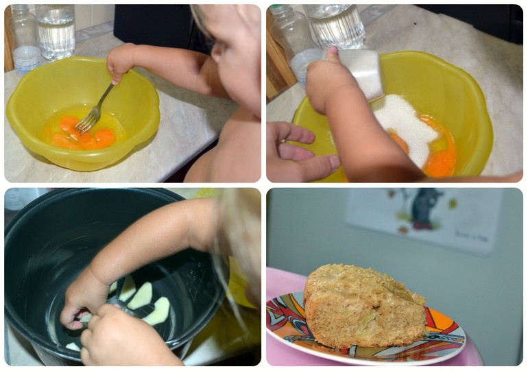 И на полдник совместными усилиями мы с Алисой приготовили яблочный пирог. Готовили в мультиварке. Получилось вкусно и очень быстро мы его съели.