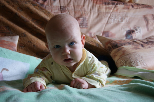Лежа на животе начинает приподниматься с упором на ладошки, но не часто и слабенько пока. Хотя ручки уже всегда в стойке готовности раскинуты в стороны.
