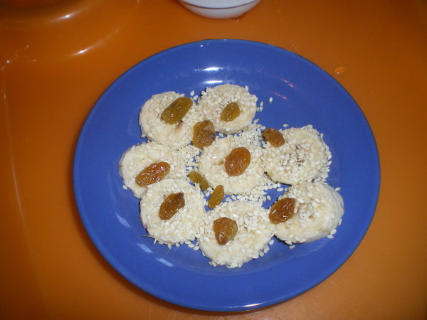 Знакомьтесь, Сенин завтрак. Кусочки бананов, обсыпаные кунжутом, и изюм.