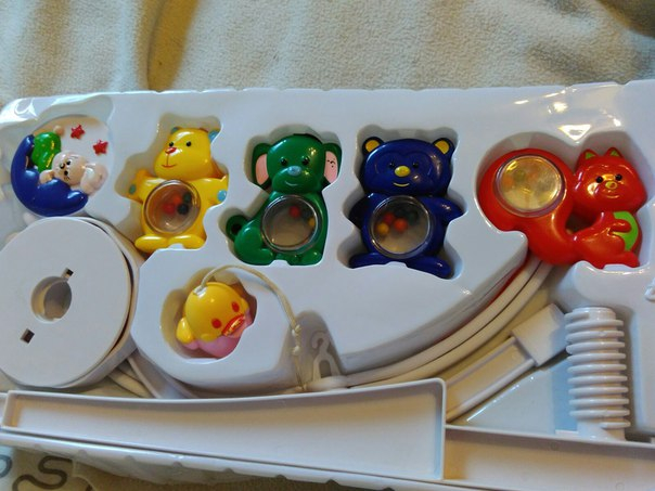 Механическая карусель, работает без батареек и электричества. Немного пользовались, но полностью исправна. Игрушки можно использовать отдельно. Развивает слух и зрение, можно вешать с рождения и до 5 мес.
