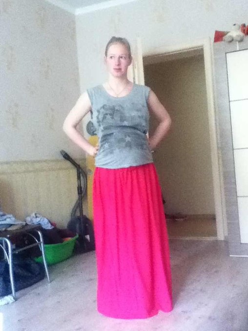 сто лет назад задумала я себе юбочку. купила тканьку (причем, собиралась купить синюю, но ее в магазине было очень мало). потом долго маялась и выбирала и, наконец, выбрала две: одну малиновую, другую - фиолетовую. мы же помним, что швея из меня.... мало похожая на швею ) так вот, нашла я мастер-класс в инете по пошиву юбки. из ткани 180 *150 сшила мое счастье. криво-косо-но-зато-своими-руками ))) а потом одела и малеха подрасстроилась. во-первых, мне кажется, вышло маловато складок. для объема не талии, а низа живота 94, видимо, надо было брать ткани больше, чтоб сидело красиво. даже подумала докупить еще и дотачать. а утром встала, примерила еще разок. и вроде ниче, все нормально. только, как ни крути, сзади юбка получается короче ))) попа большая, да и впереди резинка все равно спускается ниже. вопчим, будем носить )