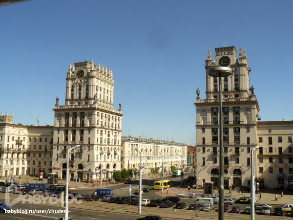 Когда приезжаешь в Минск на поезде или электричке, первое, что ты видишь, выходя на перрон вот эта площадь. Я фотографировала из окна кафе, что находится на втором этаже вокзала. Собственно дальше можно пойти гулять прямо по улице, что между этими двумя башнями. Посмотреть будет на что.