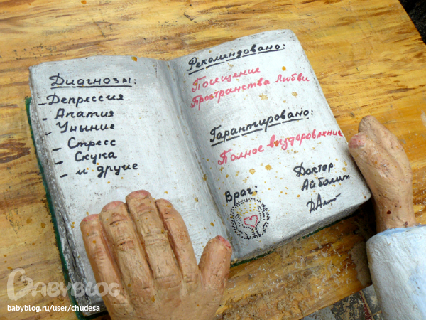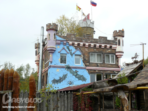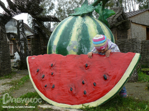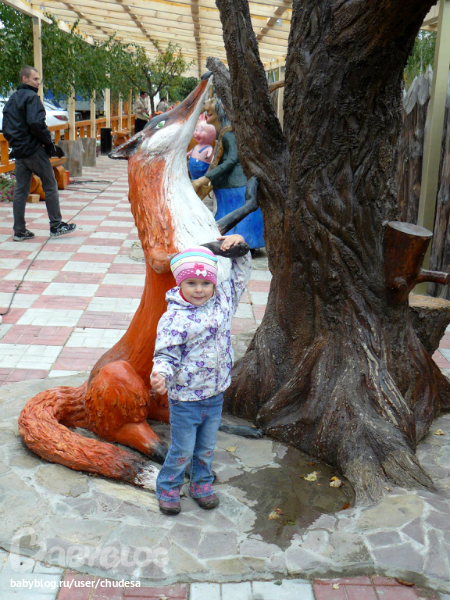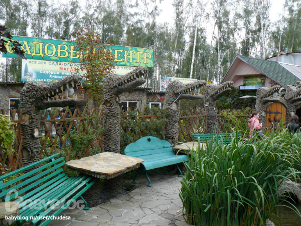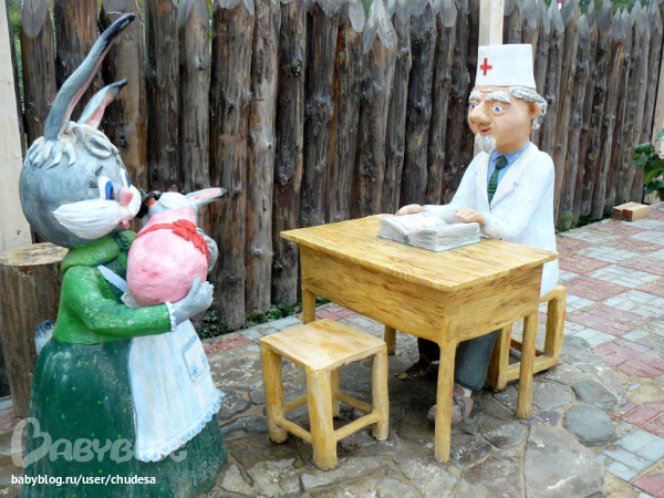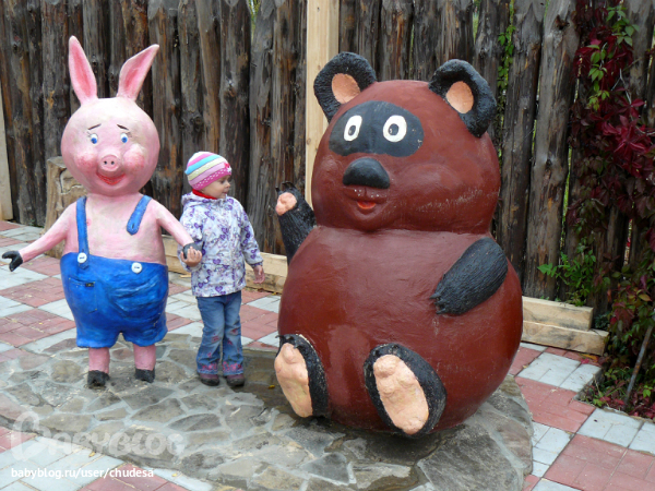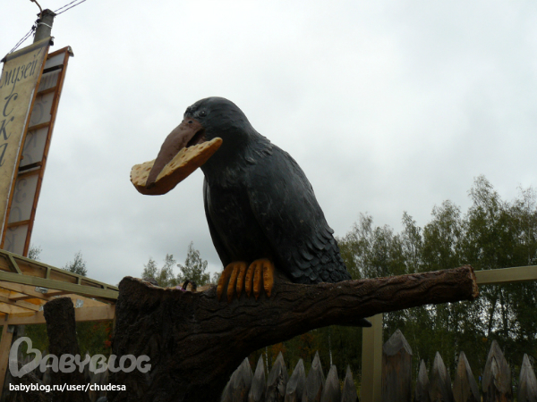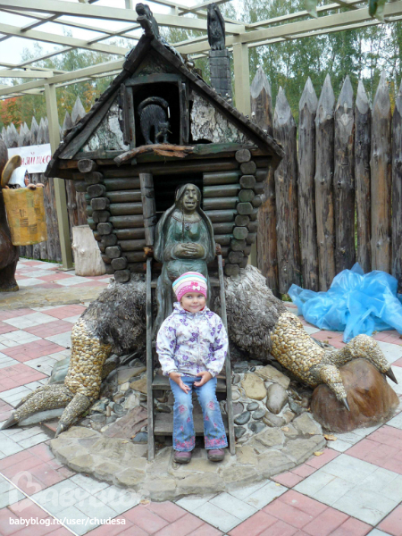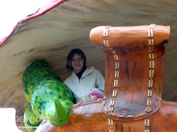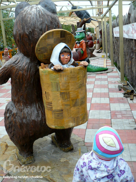 прогулки (Москва и область)обнаружили мы совершенно случайно (проезжая мимо на авто) в получасе езды от нашего дома. А именно "Музей сказок" в Домодедово (44 км Каширского шоссе, от МКАДа в 15 км). Открылся он только в мае этого года. Фигуры сказочных героев (и постройки) из дерева и бетона расположены прямо под открытым небом. Можно совершенно бесплатно бродить по всей территории, трогать все фигуры, залезать на них и фотографировать. А для желающих можно заказать экскурсию, которую проведут аниматоры, разыгрывая фрагменты из сказок народов мира.
