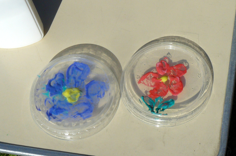 Девчата раскрашивали прозрачные крышечки из-под сметаны. Я с обратной стороны вложила листки с нарисованными цветами, а после раскрашивания убрала. Светик очень удивилась и обрадовалась тому, что получилось.
