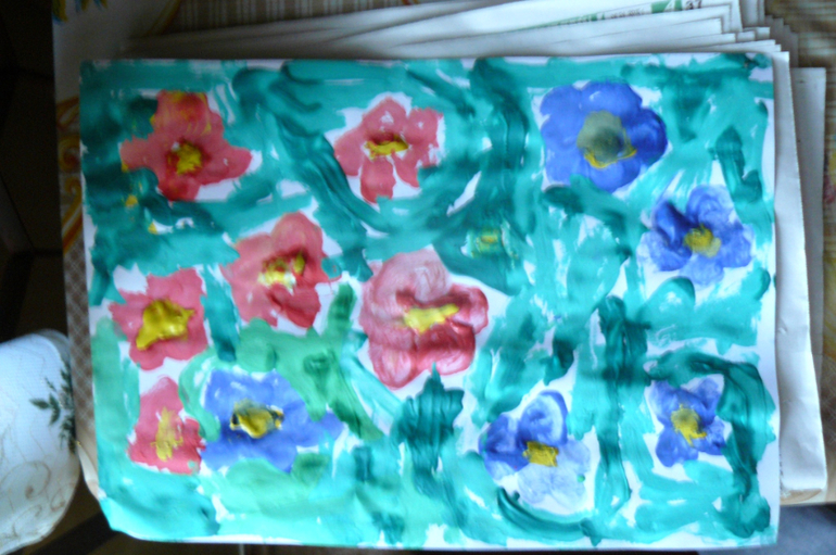 Старшую дочу настолько вдохновили цветы, что она взяла лист бумаги и нарисовала цветочный луг.